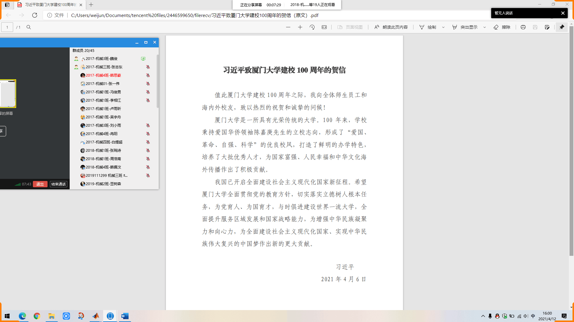 为深入学习贯彻总书记贺信精神,增强学生党员历史担当,机械本科学生第一党支部于2021年4月20日至21日开展习近平致信祝贺厦门大学建校100周年贺信精神学习主题活动。
