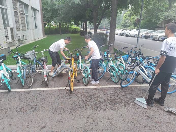 随后,各小组来到逸夫馆门前,由于逸夫馆是教学楼的缘故,每天大量共享单车停放在周围,不易于来回车辆的交通。因此,支部党员同志们将每辆车放在规定的车辆停放区,并一一进行排列,摆放完共享单车,同志们又开始清扫街道上的落叶。