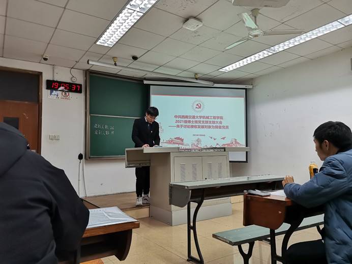 大会开始时,支部书记杨露同志首先就支部成员和支部活动开展情况作了简要汇报。杨露同志介绍到:支部共有党员26名,其中正式党员22名,预备党员4名。支部委员会成员3名,支部书记杨露主要负责协调安排支部的各项事宜;组织委员孟凡善主要负责活动出勤情况以及党支部工作记录本的记录;宣传委员龙秀珍主要负责支部的宣传工作,撰写新闻稿等。支部前期开展的工作为:对大家的党组织关系进行查档,收集补充材料并装档,完成线上和线下的党组织关系转接;完成中共十九届六中全会公报专题学习。后期将陆续开展主题党日活动、班级PADP项目系列活动,希望大家积极支持支部工作。