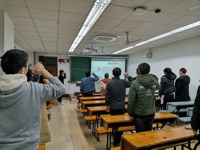 表决完成后,大家对3名新预备党员的加入表示了欢迎和祝贺,3位新同志也对支部大会讨论的结果表明了自己的态度并展望了未来的发展。杨露同志总结到,希望3位新预备党员在今后的发展中能够进一步加强学习,始终保持一颗初心,克服困难,迎难而上,不断发展创新,努力提高新时代党员的综合素质,充分发挥一名共产党员的先锋模范作用。大会最后,杨露同志带领大家宣读入党誓词,重温了入党的初衷和决心。