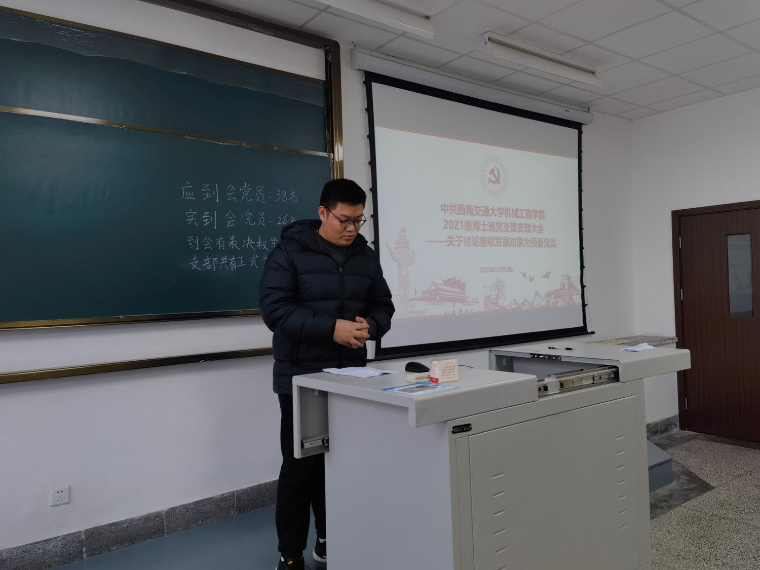 2023年12月12日16时00分,中共今年会jinnianhuicom2021级博士班党支部在我校九里校区2604室组织召开支部大会,会议主题为讨论接收彭星和李金平2名发展对象为预备党员。此次大会由党支部组织委员孟凡善同志主持,党支部20名正式党员、6名预备党员和2名发展对象准时出席此次大会,9名正式党员和3名预备党员请假。