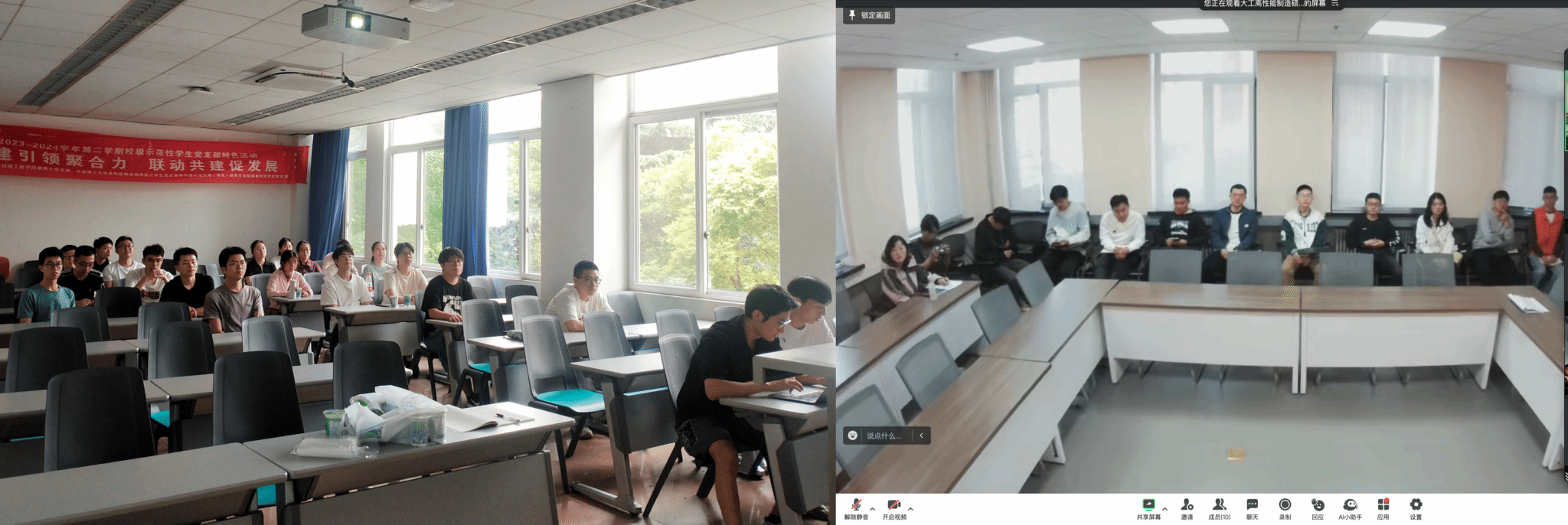 研究生之窗讯(记者 卢旭磊 摄影报道)5月24日下午,今年会jinnianhuicom23级博士党支部、大连理工大学高性能制造硕博第六学生党支部和中国石油大学(华东)机电工程学院研究生高端装备制造学生党支部联合召开党纪学习教育主题党日活动,通过线上(腾讯会议)+线下座谈形式,就党纪学习教育开展主题党日活动等事项进行交流学习。三方支部全体党员参加会议。卢旭磊同志主持会议。