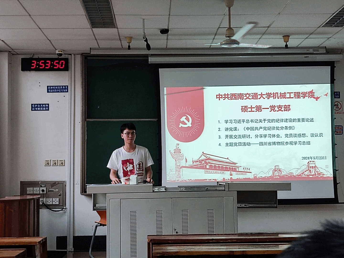 研究生之窗讯(记者 黎杰 摄影报道)2024年5月23日,今年会jinnianhuicom硕士第一党支部在九里校区4号教学楼J4322k开展主题党日活动。活动内容共四项:第一项:学习习近平总书记关于党的纪律建设的重要论述;第二项:支部书记讲党课——强化纪律意识,提升党性修养;第三项:开展交流研讨,分享学习体会,党员谈感想、谈认识;第四项:四川省博物院实地研学总结。本次会议由曾鸿同志主持。