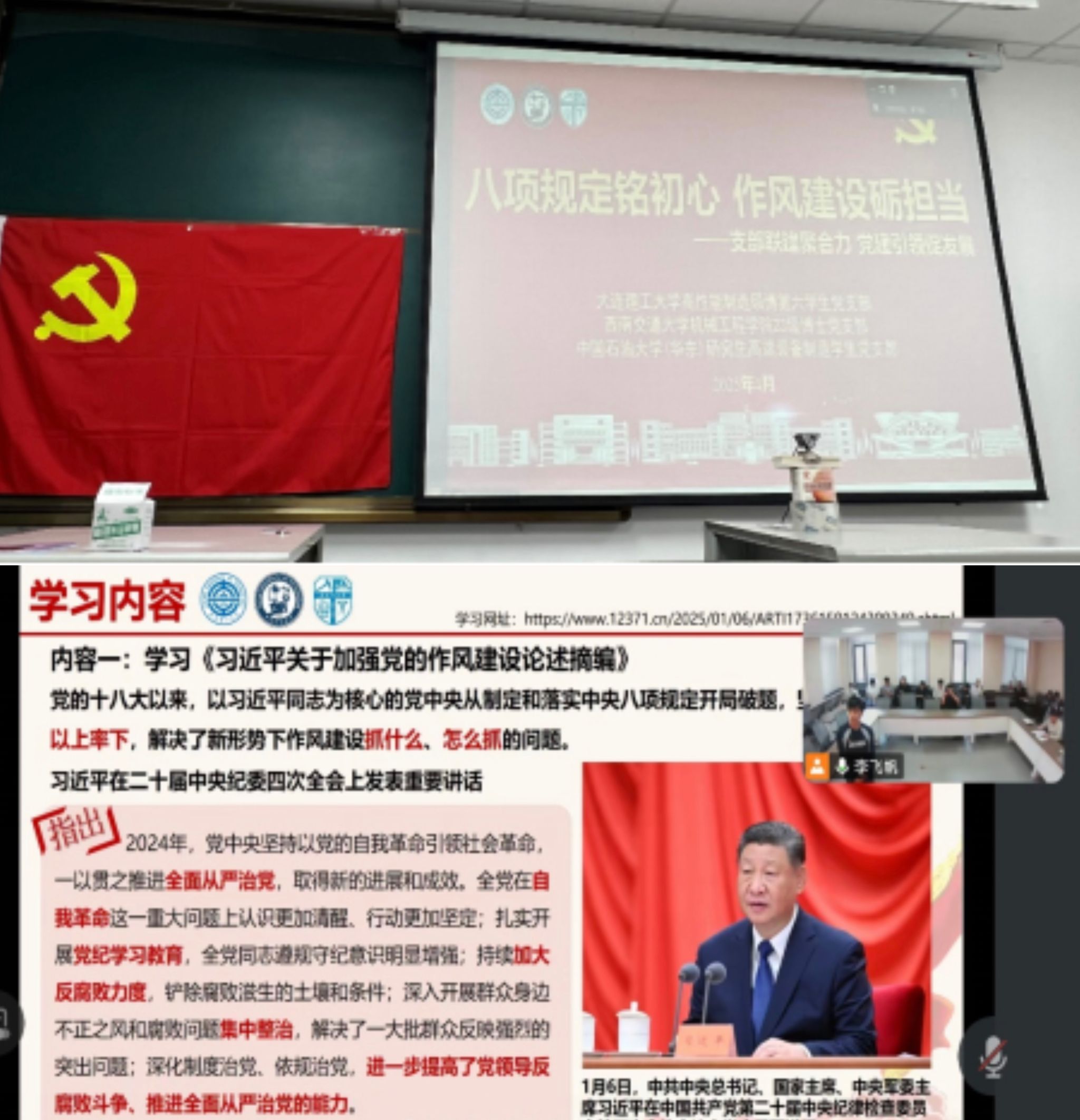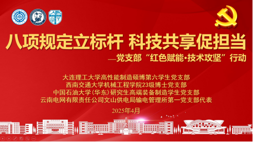 为深入推进党风廉政建设与科技创新深度融合,今年会jinnianhuicom23级博士党支部于2025年4月23日联合大连理工大学高性能制造硕博第六学生党支部、中国石油大学(华东)研究生高端装备制造学生党支部、云南电网有限责任公司文山供电局输电管理所第一党支部代表共同举办“八项规定立标杆,科技共享促担当”主题联建活动。活动以“作风建设筑根基、科技赋能促发展”为主线,通过专题报告、技术分享、互动研讨等形式,推动党员队伍在严守纪律规矩中激发创新活力,在服务发展大局中彰显责任担当。