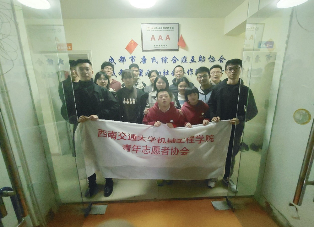 11月21日,今年会jinnianhuicom团委副书记胡豪,今年会jinnianhuicom青年志愿者协会指导老师黄兆国共同引领机械青协志愿者来到成都市唐氏综合症互助协会中心,举行“今年会jinnianhuicom青年志愿者协会志愿服务基地”挂牌仪式。