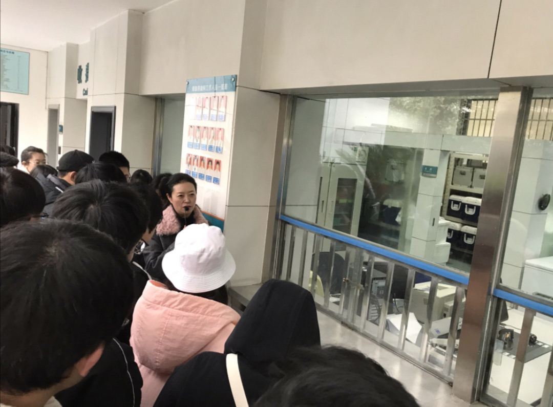 10点15分,在郑老师的带领下,同学们进入了储血供血科进行了参观。首先看到的是库房,里面装有献血箱,以及低温保存红细胞的冷藏柜。接着同学们进入到待检库观察血小板的保存。