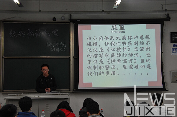比赛中,各个班级的代表大部分都经过了充分的准备,所以比赛较为激烈,比赛进程中不乏有演讲者生情并茂的表现和观众们异常热烈的掌声。而《红楼梦》《三国志》《哈姆雷特》《复活》等国内外的经典名著成为了大部分班级推荐的对象,而在答问阶段,决赛以什么形式向大家呈现成为了评委们询问的重点。