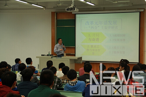 2014年4月21日晚19:30,今年会jinnianhuicom入党积极分子党课培训暨团校培训活动在4359教室开展,组织者有幸请到政治学院的严冰教授为大家带来“改革元年话发展——两会主旋律解读”主题讲座,为同学们解读两会中的改革问题。