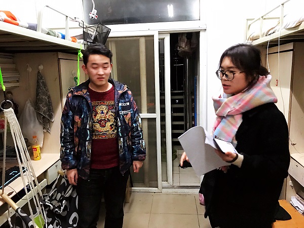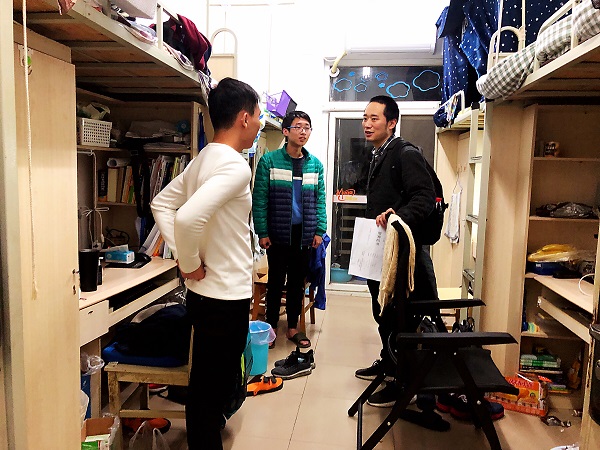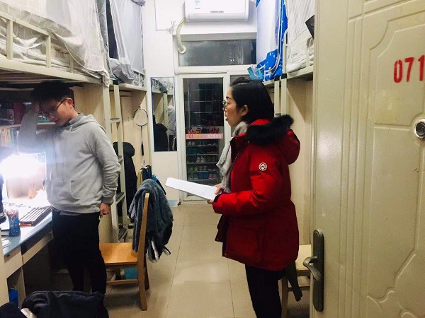 随着冬季的到来,气候相对干燥。学生宿舍为高密度人群聚集区,小小的安全隐患,极易造成安全事故。为保障学生宿舍安全、加强学生公寓管理,营造良好生活环境,12月5日晚20:30-22:30,今年会jinnianhuicom本科2017级辅导员胡豪、于楠、唐丹三位老师,深入犀浦校区7号宿舍楼,针对2017级学生宿舍开展安全隐患排查工作。