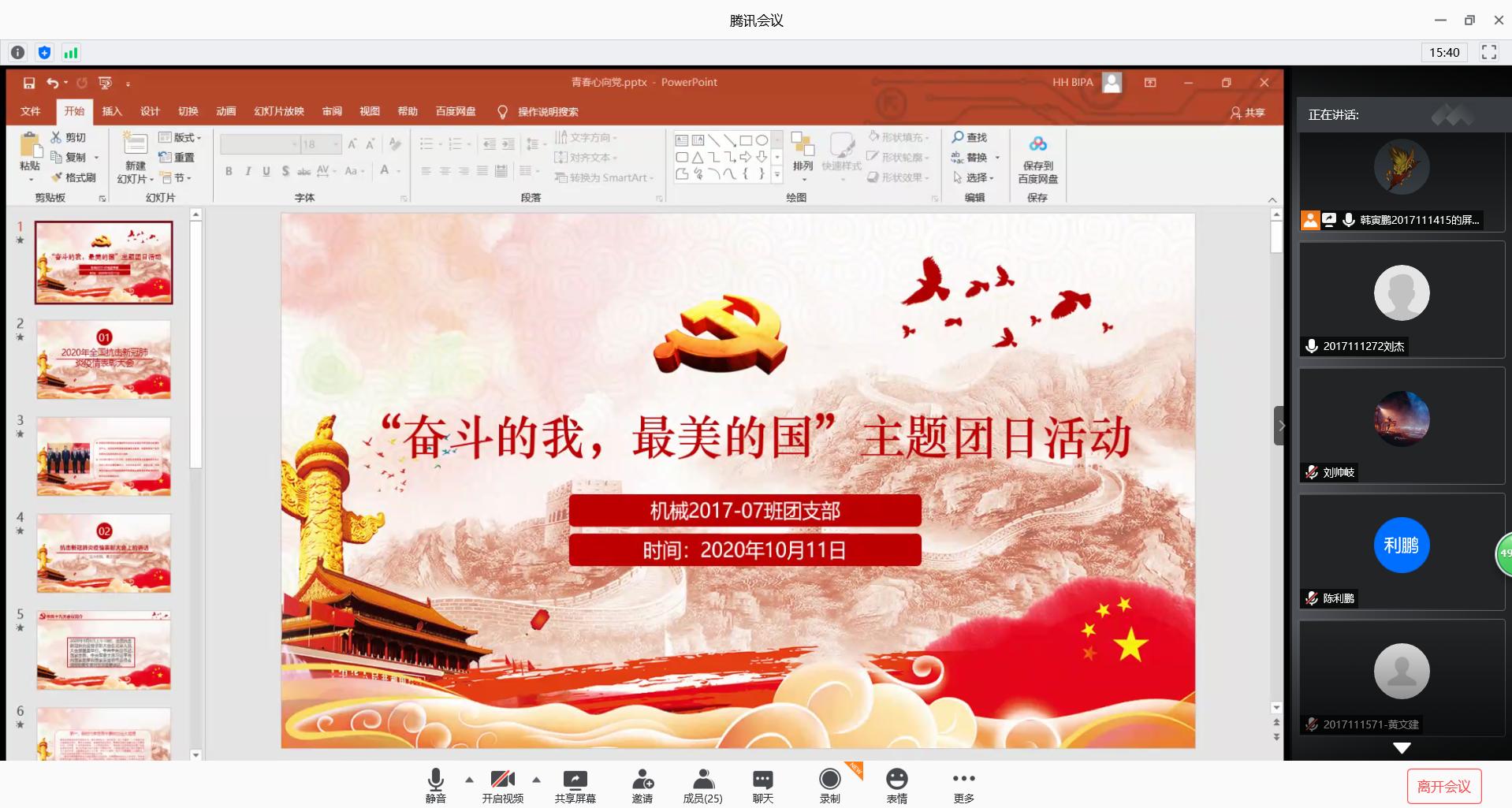 2020年10月11日下午14:30,机械2017-07班团支部在腾讯会议开展了“奋斗的我,最美的国”主题主题团日活动,参加团日活动的有机械2017-07班团支部全体成员。会议由团支书韩寅鹏同学主持。