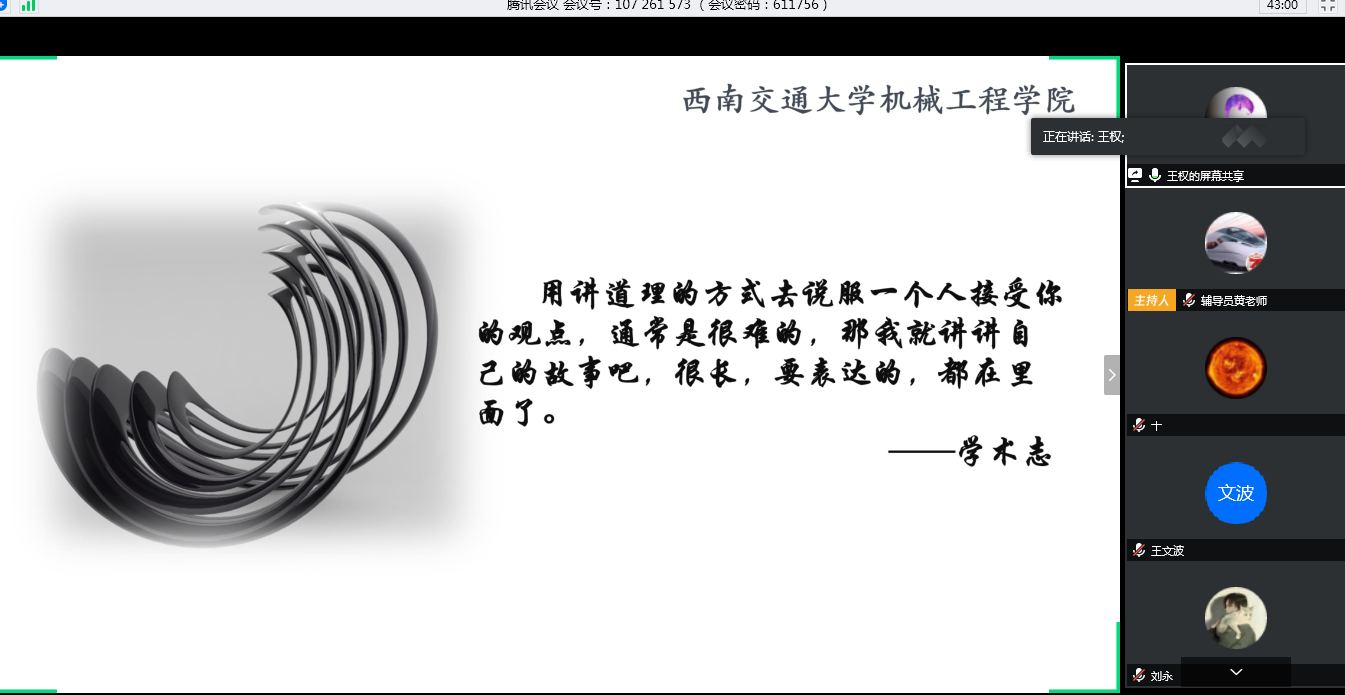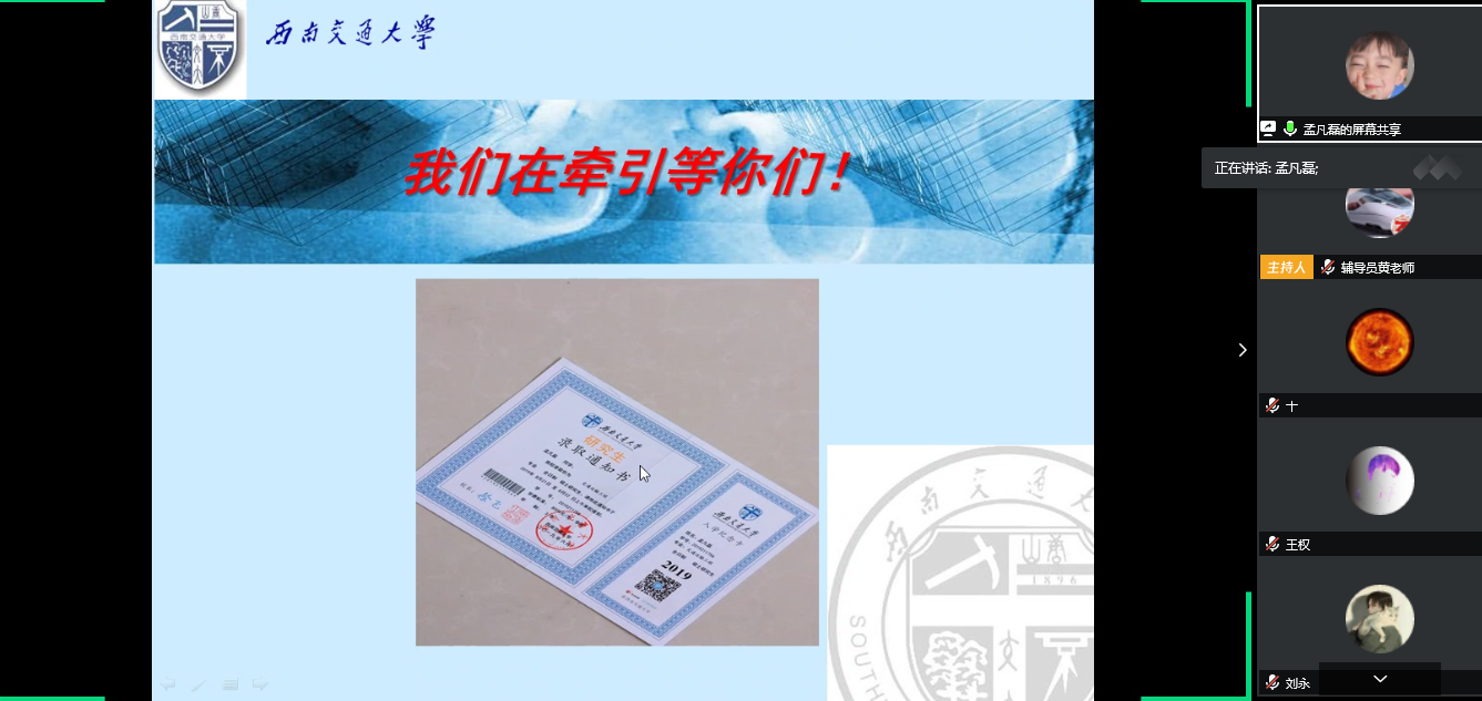 为应对新冠肺炎疫情对毕业生就业工作的影响,贯彻落实教育部和学校关于做好就业指导的相关要求,实施精准指导,421日下午2:00,来自机械学院和牵引动力国家重点实验室的不同专业的13名同学为即将参加2020年考研复试的毕业生同学分享了自己往年的复试经验,机械学院就业指导老师黄兆国主持了本次活动。