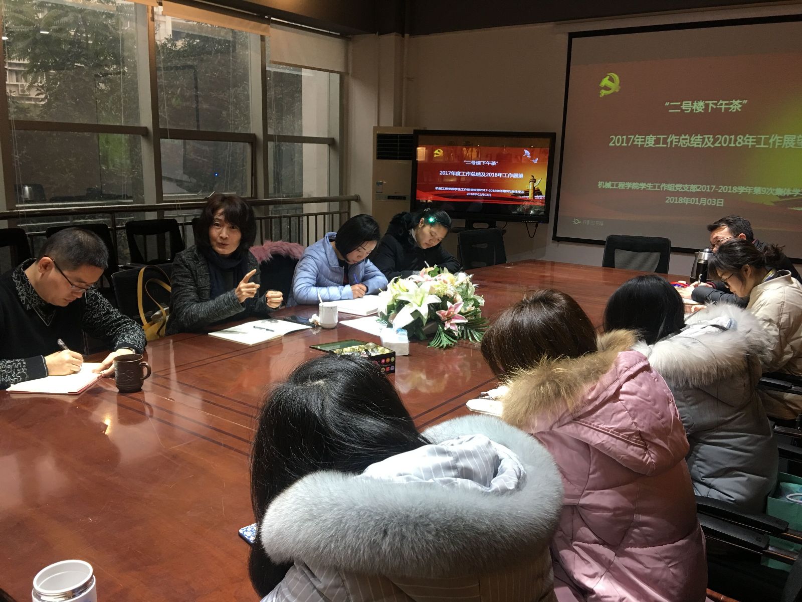 2018年1月3日,今年会jinnianhuicom学生工作在X2201召开2018年第一次“二号楼下午茶”组织生活会,学院党委书记战凤同志、党委副书记李毅同志、全体专、兼职辅导员参会。组织生活会分为两个部分,首先是全体与会成员学习了《金年金字招牌诚信至上辅导员队伍建设规定》,第二个部分是全体成员通自我批评和提意见的方式对2017年的工作进行了总结梳理,对2018年工作进行了规划和思考。