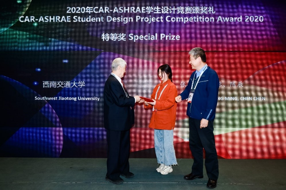 2021年4月8日,获奖团队的学生和指导老师应邀参加了中国制冷学会在上海举行的CAR-ASHRAE学生设计竞赛颁奖典礼。出席本次颁奖礼的嘉宾包括中国工程院江亿院士,竞赛评审委员会主席、北京市建筑设计研究院有限公司顾问吴德绳总工,建筑环境与能源应用工程学科专业指导委员会主任、清华大学朱颖心教授,建筑环境与能源应用工程专业评估委员会主任、清华大学李先庭教授,江森自控副总裁兼中国区总经理朱永焕先生,以及来自各参赛院校的老师和学生。我校获奖团队的学生代表和指导老师上台领奖,并作为参赛学生代表和优秀指导教师代表发表了获奖感言。