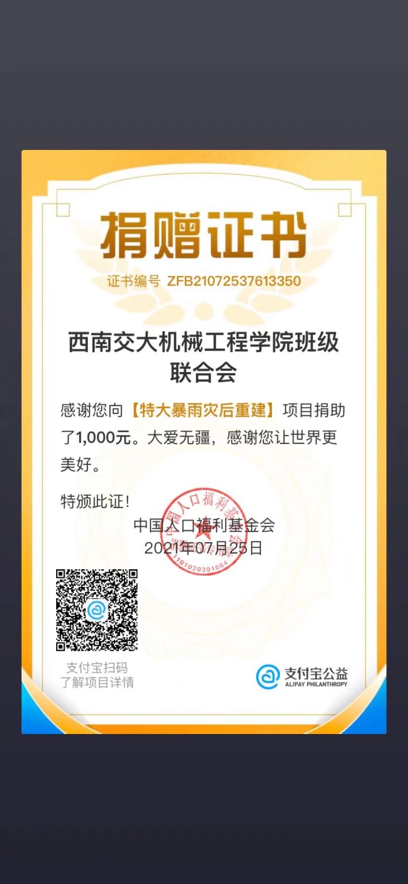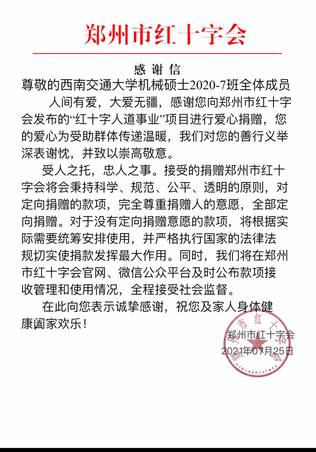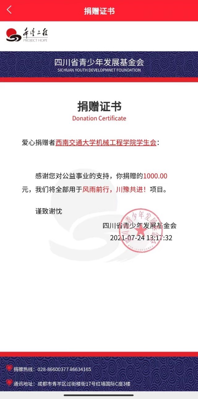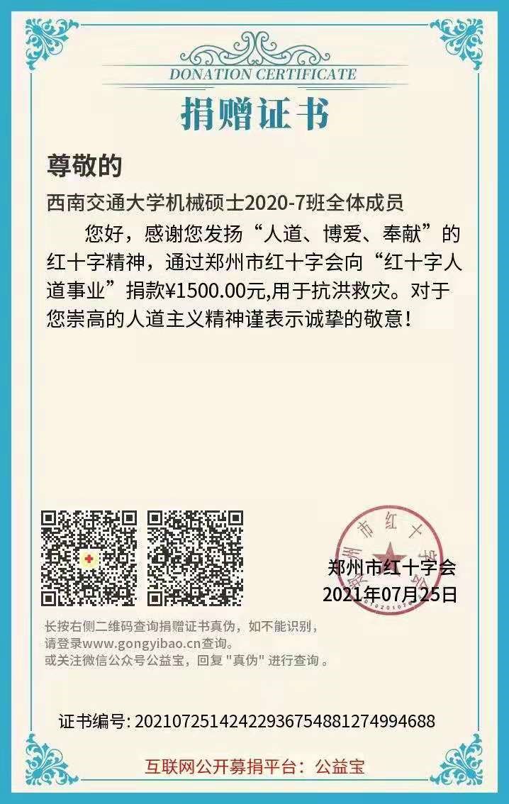 学院团学组织及学院各班级同样重视此次灾情,各团学组织及班级都在积极关心并援助河南。其中今年会jinnianhuicom学生会,今年会jinnianhuicom班级联合会各捐款人民币1000元,机械硕士2020-07班捐款人民币1500元。