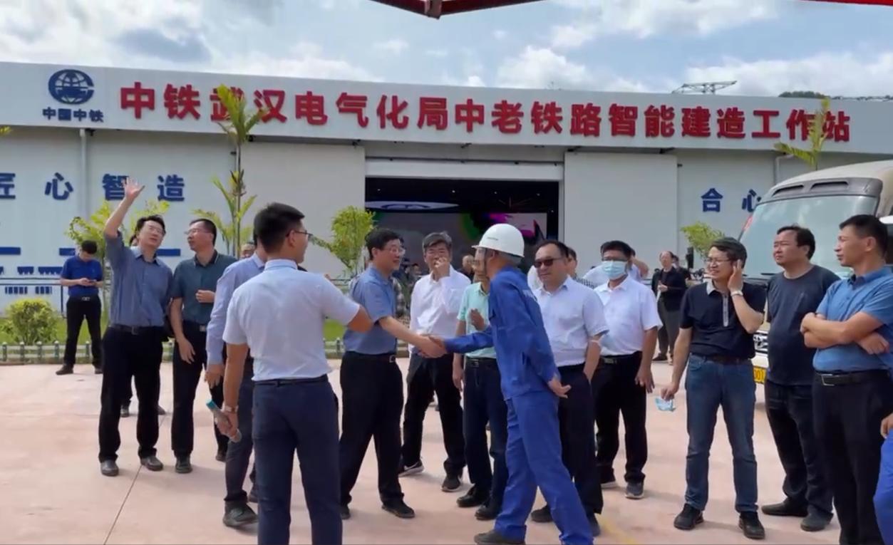 2021年10月13日,中国国家铁路集团有限公司副总经理王同军、中铁武汉电气化局集团有限公司党委书记、总经理毛明华一行在中老铁路玉磨段磨憨站观摩调研隧道综合智能作业车,并亲切接见了以邓斌教授为主要技术负责人的研发团队。