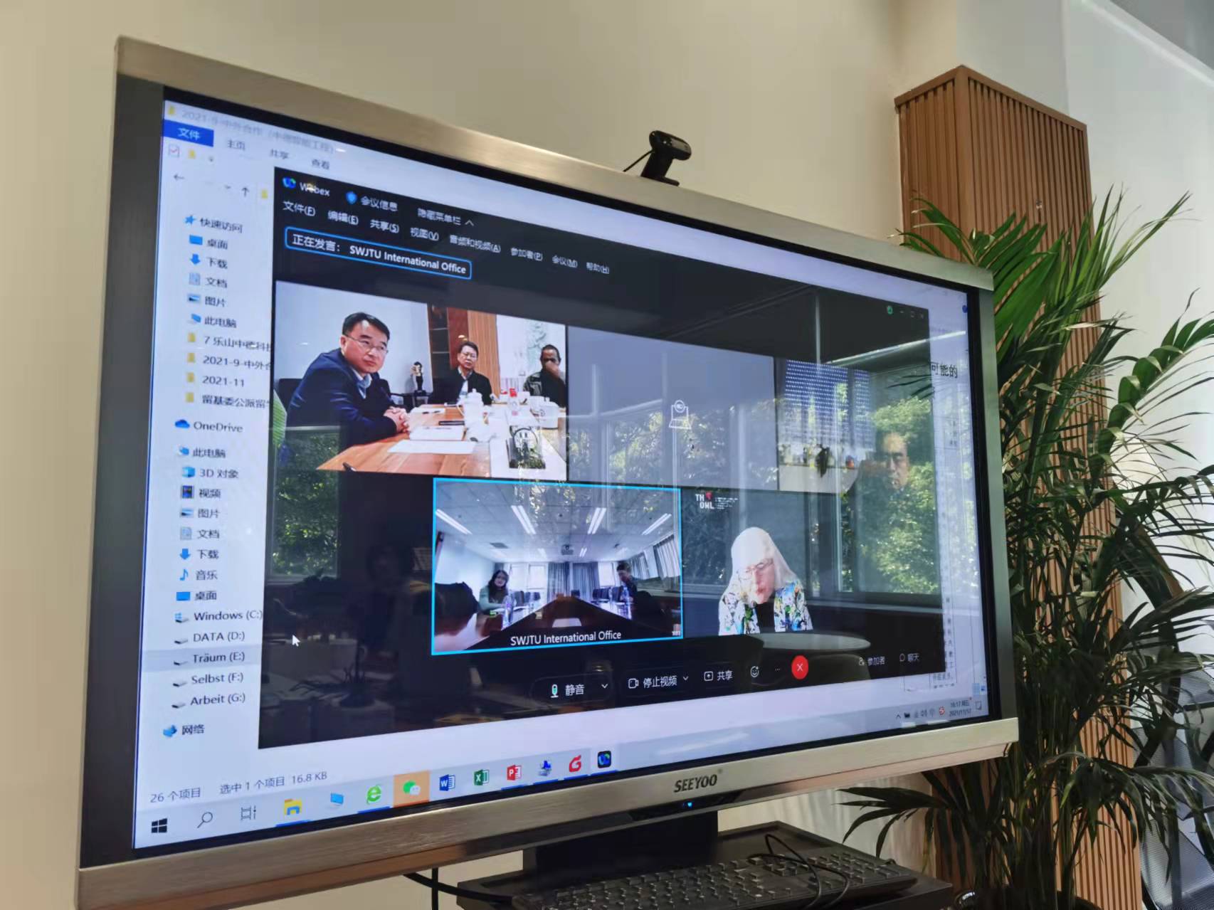 下午四点,与会全体成员与德方宋坚教授、国际处任新红处长、陆霞副处长、利普大学Frau Prof.Dr.Meier召开网络视频会议,双方就中德合作办学项目师资问题解决办法进行了深入探讨。