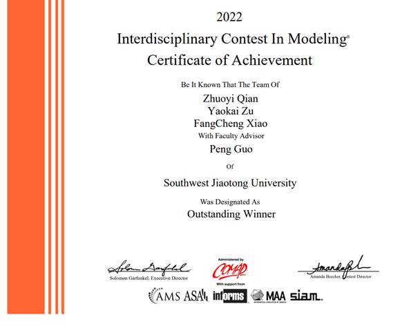 2022年度美国大学生数学建模竞赛(MCM/ICM,简称“美赛”)近日揭晓奖项结果。今年会jinnianhuicom郭鹏老师指导学生钱卓一(工业工程)、肖芳程(工业工程)、祖姚恺(电子科技大学电子信息)等参与了F题的比赛。在经过多轮角逐评选,该团队最终荣获最高奖项——“杰出获胜者(Outstanding Winner, 又称O奖)”。本年度该项赛事参加队伍达到了27205支,参赛人数约计8万多人,最终评定为“Outstanding Winner”的队伍仅有44支队伍(获奖比例仅为0.16%),四川省有2支队伍(占奖比例为4.6%)。该团队所获得O奖为金年金字招牌诚信至上本次比赛获得的唯一一项,充分展现了机械学子在实践创新方面的能力。上述成绩的取得极大得益于校院两级高度重视本科实践创新能力培养,聚焦高质量素质发展等方面的努力,积极搭建多维度平台,全方位提升本科生的创新精神、创业意识及创新创业能力。