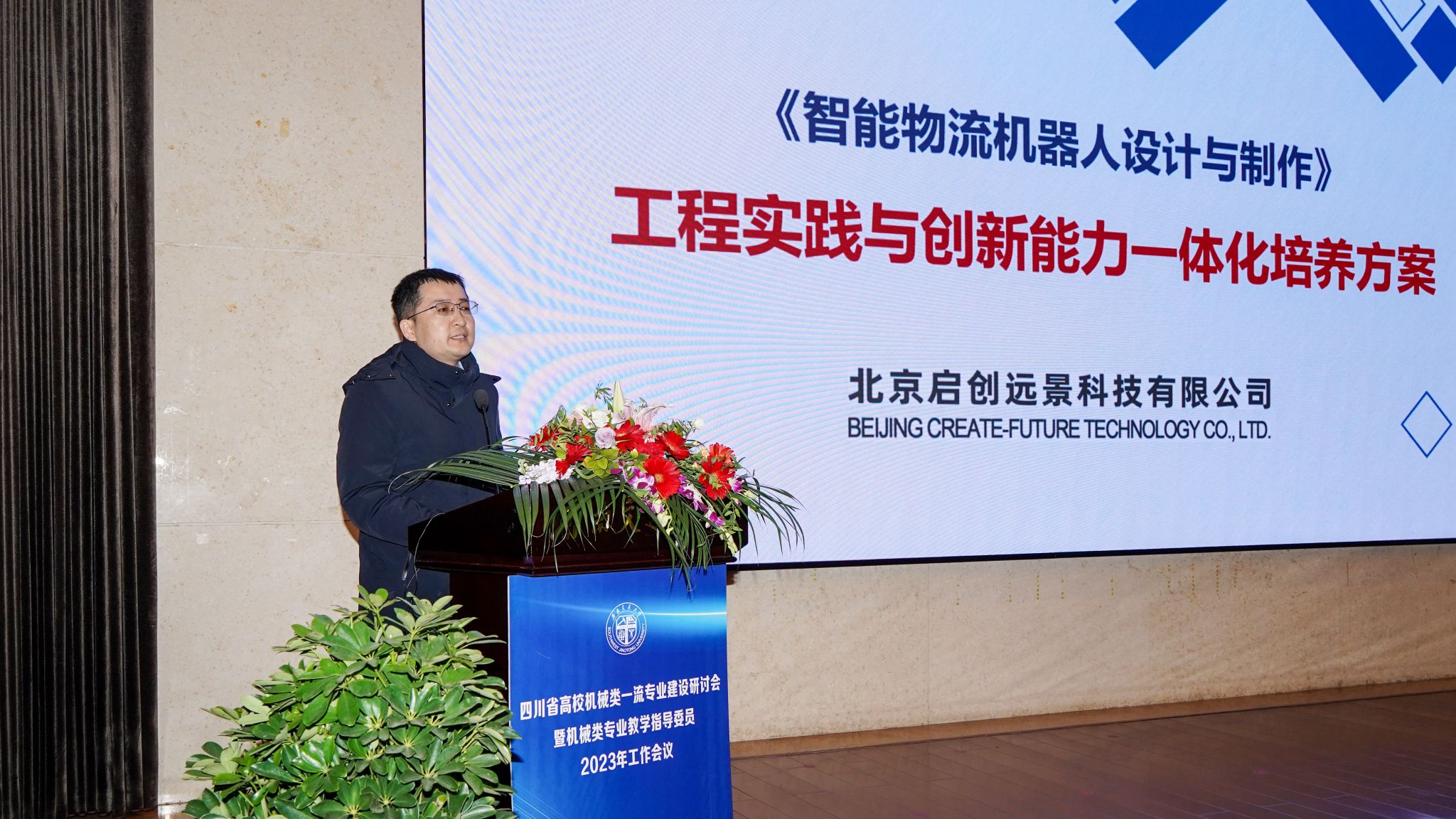 北京启创远景科技有限公司秦志宏总经理以《工程实践与创新能力一体化培养方案》为题,介绍了公司开发的《智能物流机器人设计与制作》课程目标、课程设计、课程资源,构建由支撑课程、支撑竞赛、着重实践、突出创新组成的人才培养体系。