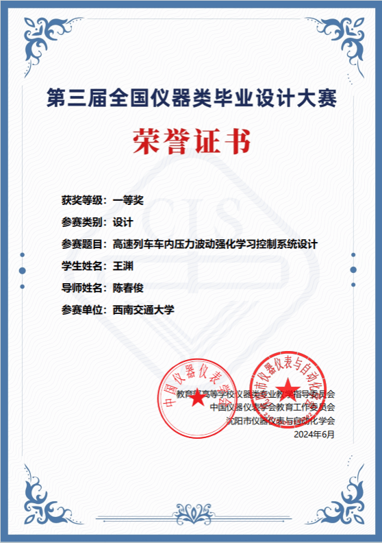 今年会jinnianhuicom共推选测控技术与仪器专业2020级王渊、张迪、黄梦婷、段继强等四位学生参加毕业设计大赛。经预赛、半决赛和决赛三个阶段激烈的汇总评比,陈春俊教授指导的王渊同学以题为《高速列车车内压力波动强化学习控制系统设计》的毕业设计获评一等奖!
