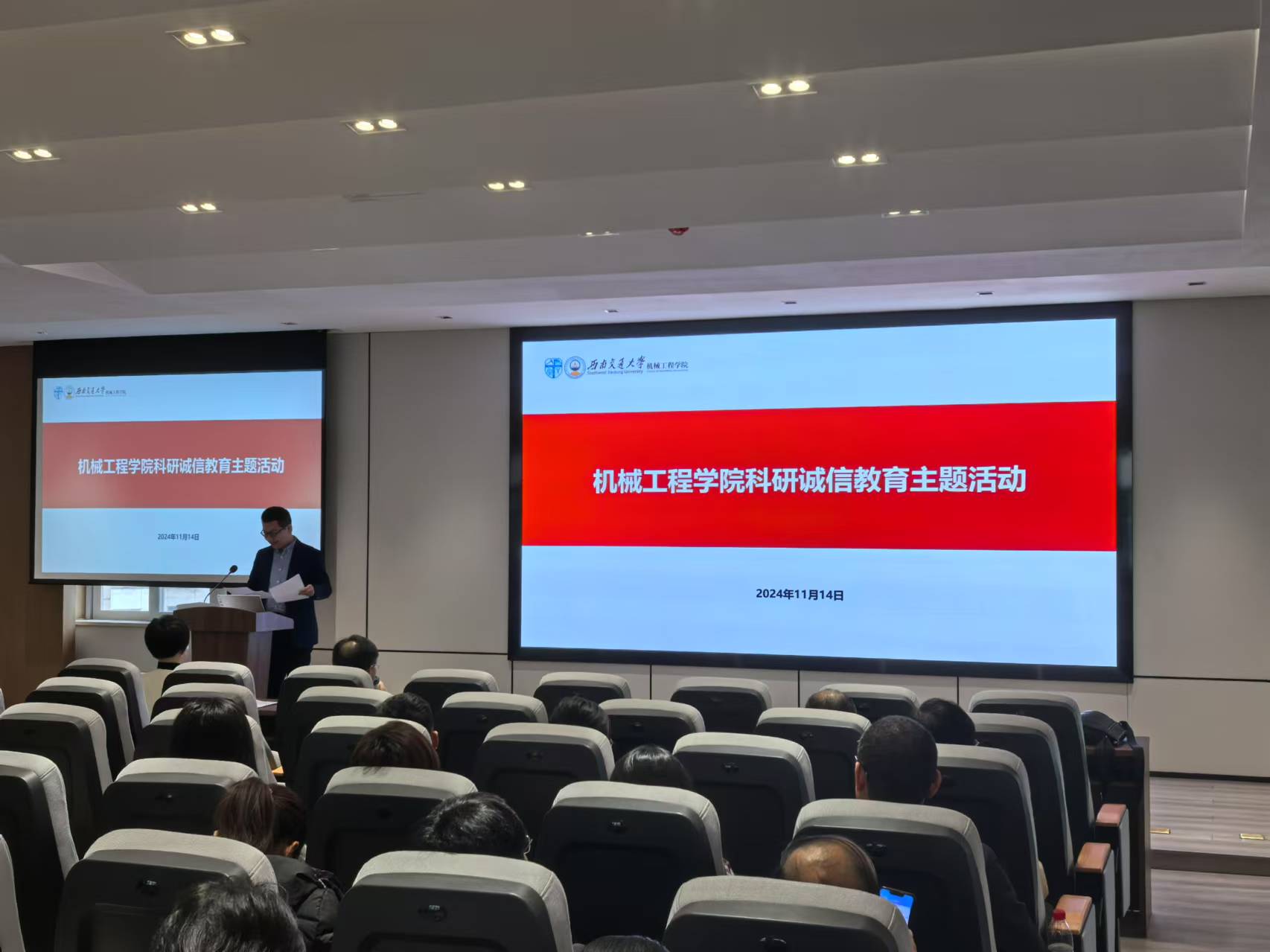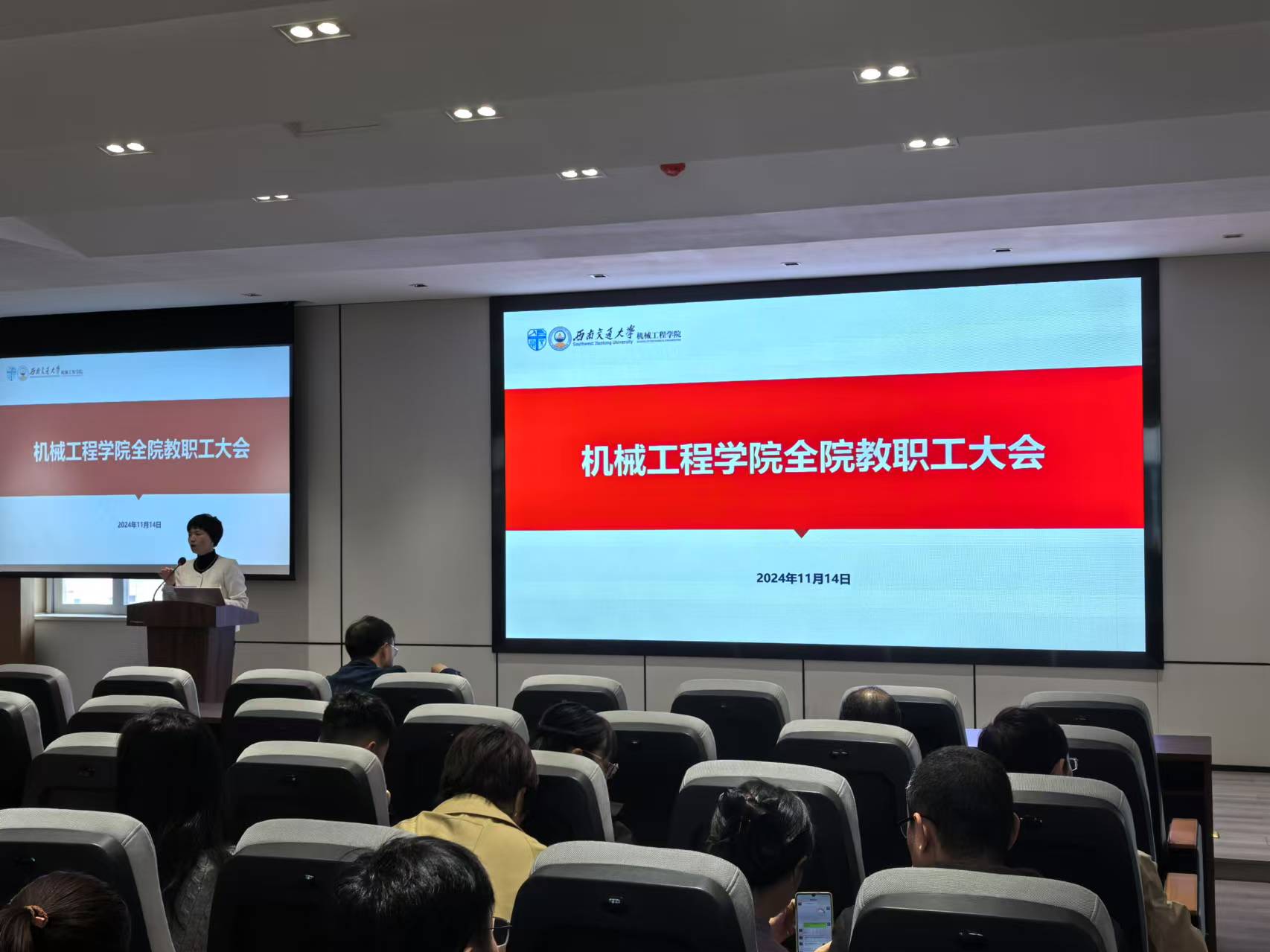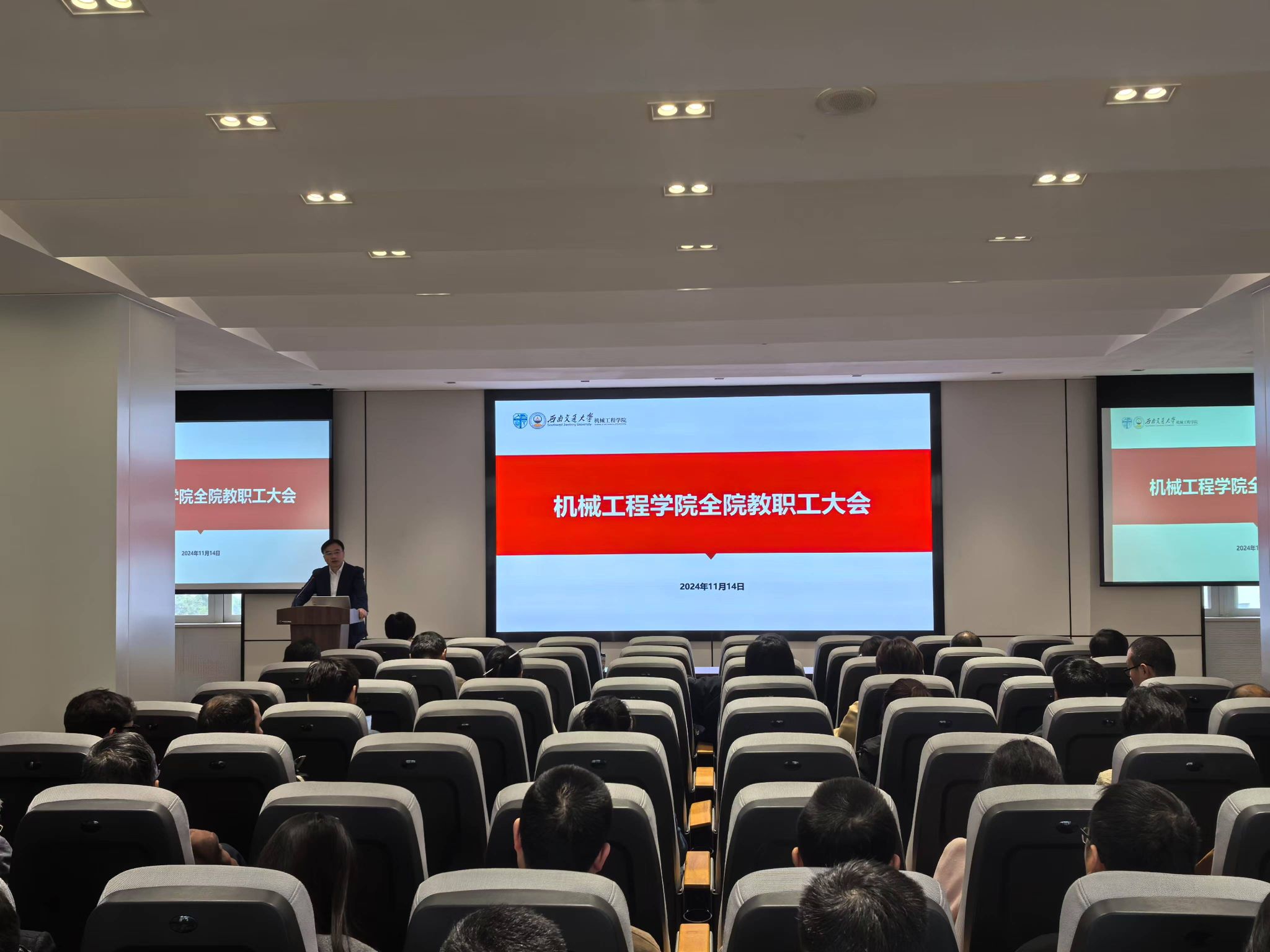 2024年11月14日下午,今年会jinnianhuicom在机械馆J2530召开全院教职工大会。大会由学院党委副书记、纪委书记、副院长曾东红主持,学院院长钱林茂主讲,特别邀请科学技术发展研究院副院长李怀龙到场对教职工进行科研投标违纪案例的警示教育。
