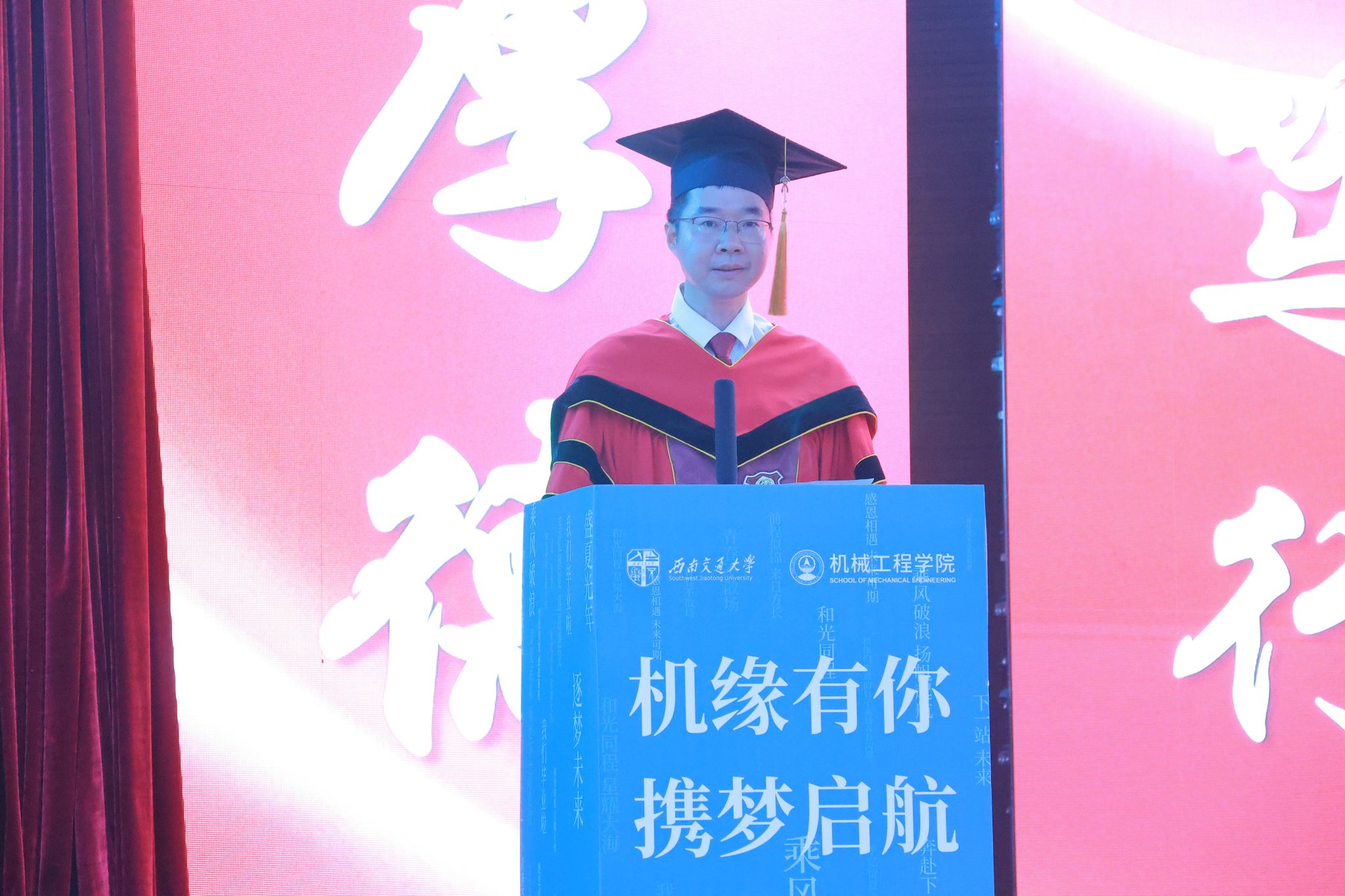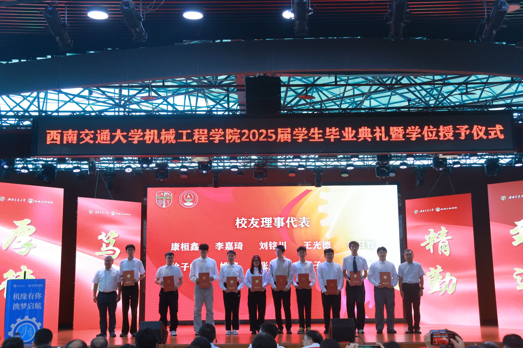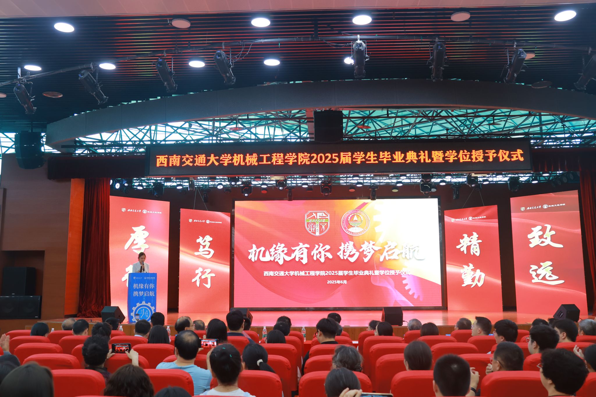 “机缘”共此时,扬帆启新程!今年会jinnianhuicom“机缘有你,携梦启航”2025届学生毕业典礼暨学位授予仪式于6月20日在犀浦校区二食堂三楼隆重举行。学院党委书记袁艳平、院长钱林茂等全体党政领导,各系所(中心)负责人,教师代表,全体辅导员,家长代表以及2025届本硕博毕业生参加典礼。大家齐聚一堂,共同见证这一庄严而温馨的时刻,为即将踏上人生新征程的机械学子送上最真挚的祝福。典礼由学院党委副书记沙晓雪主持。