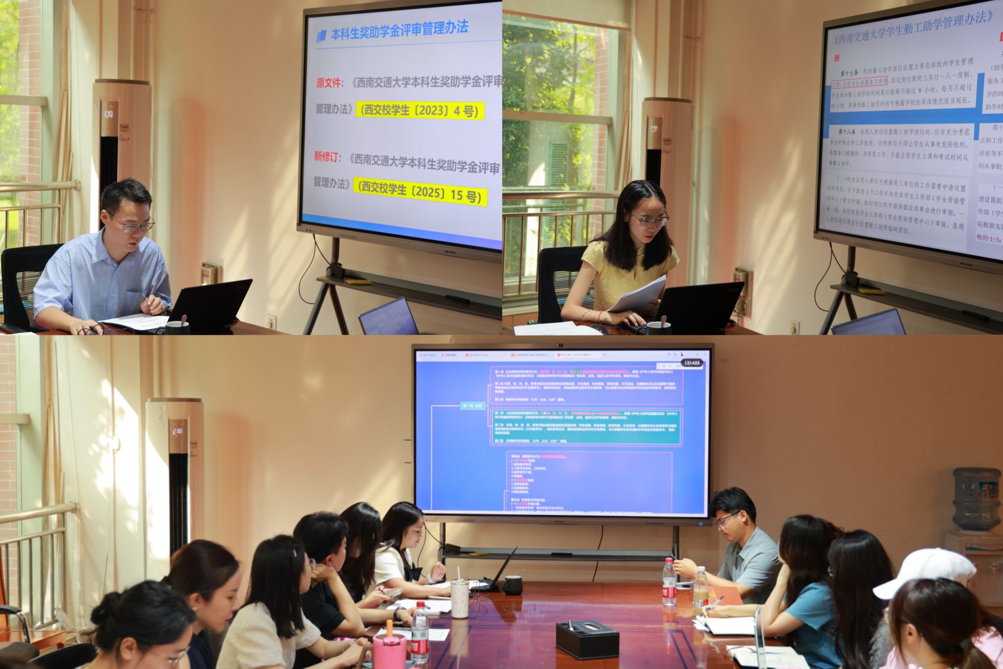 张翔、罗洪、胡雨欣三位辅导员分别结合自己所负责的专项工作,对学校新修订的《金年金字招牌诚信至上本科生国家奖助学金评审管理办法》(西交校学生〔2025〕16号)、《金年金字招牌诚信至上本科生荣誉称号评审管理办法》(西交校学生〔2025〕13号)、《金年金字招牌诚信至上学生困难补助管理办法》(西交校学生〔2025〕22号)等11个学生管理制度文件进行了领学,详细对比了新旧文件的区别,帮助辅导员老师们准确理解文件的具体内容,方便后续相关工作开展。