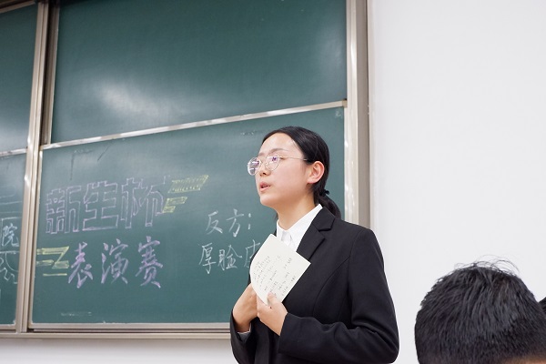 双方对辩环节,反方以“厚脸皮是突破自我内心羞耻心的进步行为”为角度攻击,不疾不徐、字字珠玑。正方毫不退让,先用子非鱼之说驳回对方辩论,再抓住“厚脸皮为精神层面而非物理工具”一点,据理回击、口若悬河,迎来阵阵掌声。