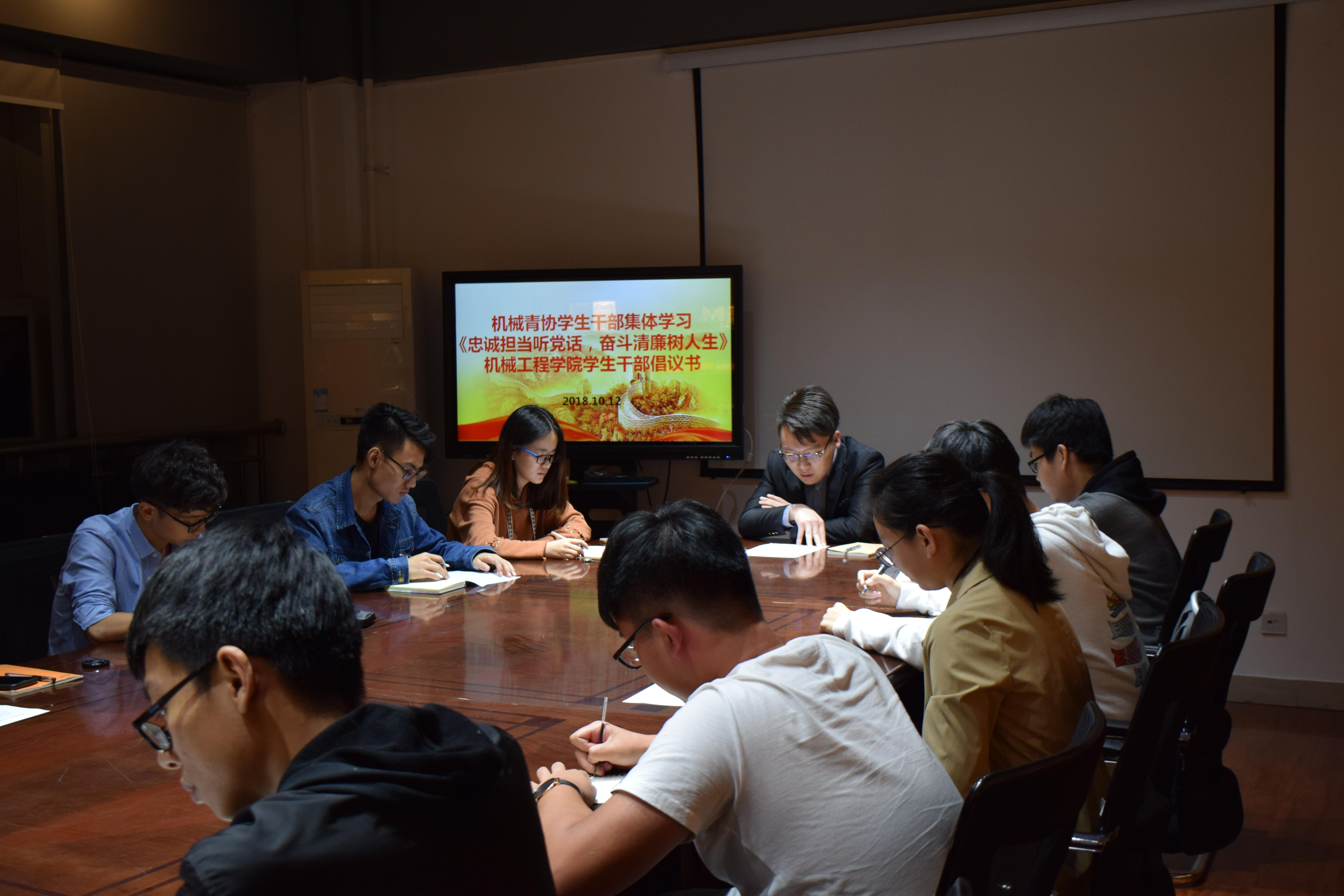 10月12日晚21:20今年会jinnianhuicom青年志愿者协会在X2201集体学习了《忠诚担当听党话,奋斗清廉树人生——今年会jinnianhuicom学生干部倡议书》。参与此次会议的有机械青协指导老师黄兆国,机械青协全体学生干部。本次学习会旨在端正学生干部的学习和工作态度,针对近期的某些高校学生组织官僚化的恶性事件进行自查,有则改之,无则加勉。