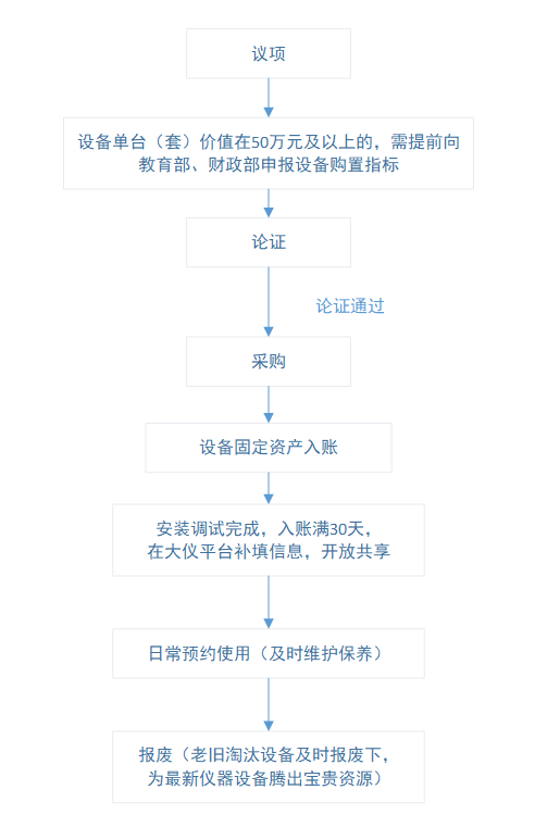 根据《金年金字招牌诚信至上仪器设备、家具管理办法》(西交校资实〔2019〕19号)及《金年金字招牌诚信至上大型仪器设备开放共享管理办法》(西交校资实〔2022〕5号)精神,大型仪器设备管理是从议项、申报购置指标、论证、采购、设备固定资产入账、共享使用到报废的全过程进行综合管理,具体管理流程如下: