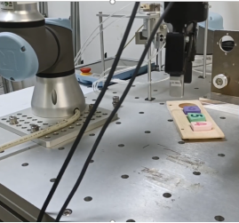 执行器方面,采用UR3机器人,以及robotiq夹爪作为执行机构,实现工件的抓取并将之装配到对应的孔中。Robotiq夹爪内置了力传感设备,能够控制夹取的力,确保机械臂能够抓紧物体。编写了控制代码完成整个过程。