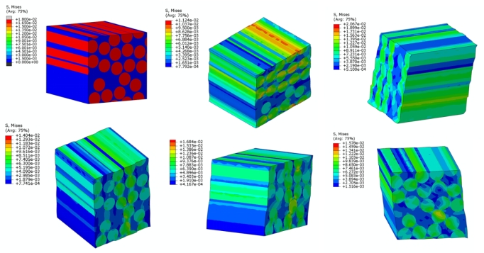 在材料参数方面,分别研究了使用复合材料设计零件的常用方法,即均匀化尺度之间的弹性刚度特性,从而提供有效弹性特性的估计值。代表体积元(RVE)均质化方法可以更准确计算等效弹性模量。因此本文使用顺序多尺度的方法,编写Python脚本完成了随机纤维分布RVE建模,如图所示。在随机纤维建模过程中,玄武岩纤维直径为10um,RVE体积为50um×50um×50um,纤维体积分数为60%,使用逐层搜索的方式来实现随机纤维建模,最后利用参数化建模在Abaqus中完成建模。