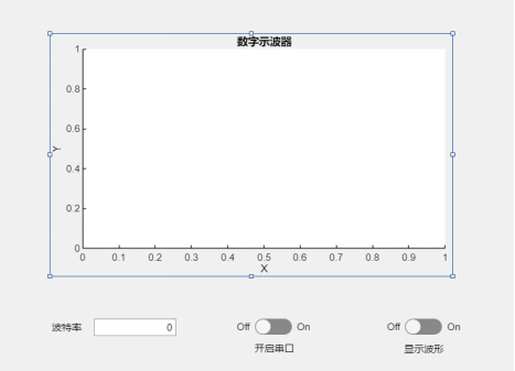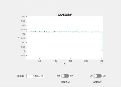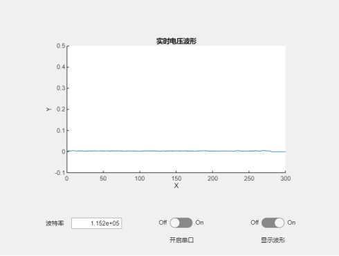 其中,XGZP6847A传感器作为本设计中的核心器件之一,它直接影响了血压脉搏计的测量精度,我使用硅胶软管以及一些软管接头将该传感器与微型气泵、泄压阀和血压计袖套密封连接了起来。同时,为了能更直观地观察到该气压传感器的测得值以便后续的代码调试,我利用matlab的app designer设计了一个简易的数字示波器,并在keil5中编写相应的代码使单片机能通过串口将气压测得值(电压值)传送到电脑中,这样就能把气压值波形画出以便后续对这些气压值进行相应的处理,下图中展示的是我编写的简易数字示波器界面: