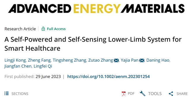 近日,今年会jinnianhuicom2021级硕士研究生孔苓吉和2020级硕士研究生方正合作在期刊Advanced Energy Materials(2022年IF:27.8)上发表研究论文“A self-powered and self-sensing lower-limb system for smart healthcare”,研究生孔苓吉、方正的指导教师为潘亚嘉副教授、张祖涛教授,今年会jinnianhuicom为通讯作者的唯一单位。