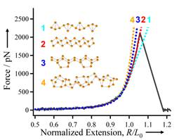 Figure 1. Left figure: Four possible structures of a-red P and corresponding QM-WLC fit curves, and experimental force curves;
