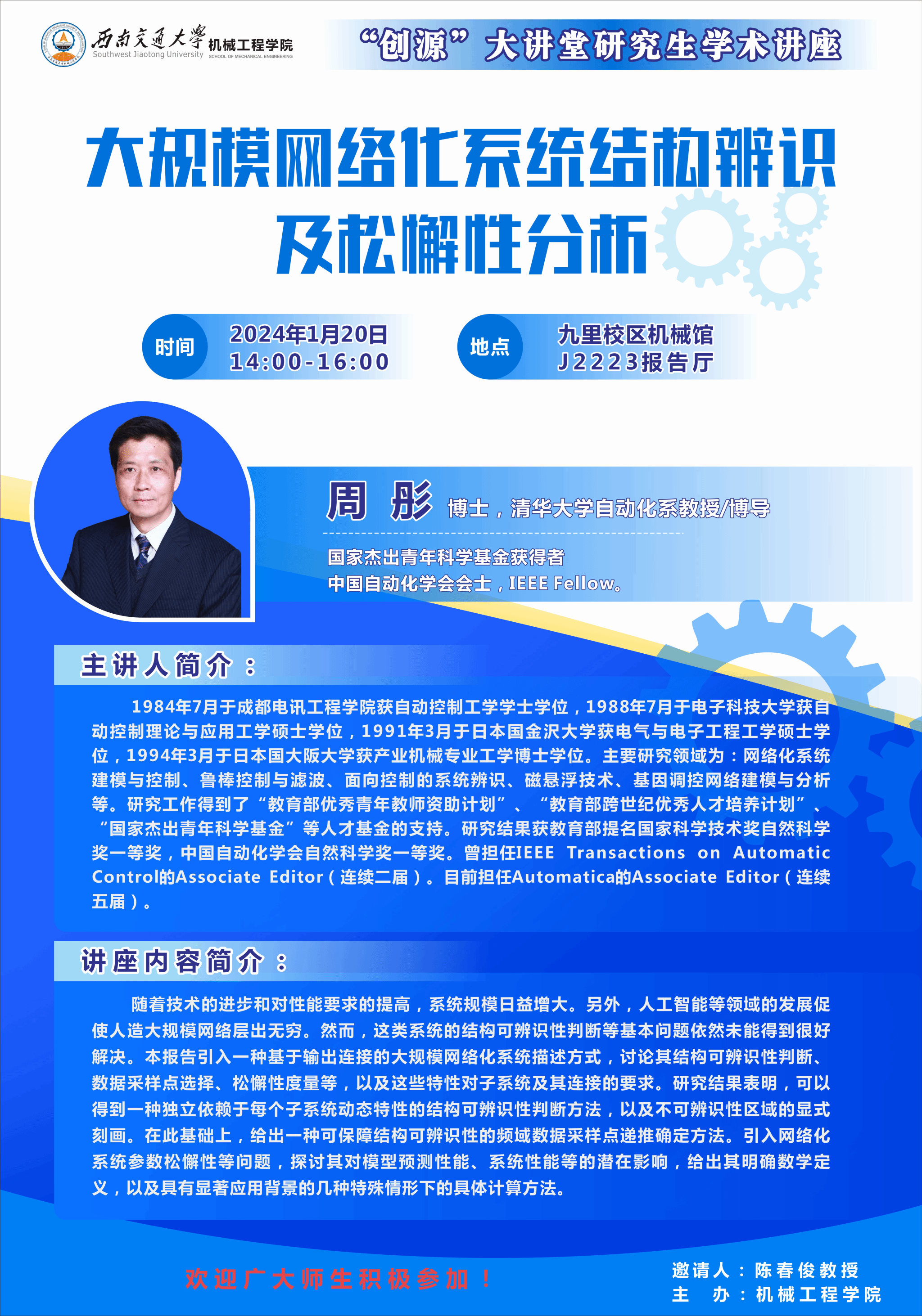 讲座内容简介:随着技术的进步和对性能要求的提高,系统规模日益增大。另外,人工智能等领域的发展促使人造大规模网络层出无穷。然而,这类系统的结构可辨识性判断等基本问题依然未能得到很好解决。本报告引入一种基于输出连接的大规模网络化系统描述方式,讨论其结构可辨识性判断、数据采样点选择、松懈性度量等,以及这些特性对子系统及其连接的要求。研究结果表明,可以得到一种独立依赖于每个子系统动态特性的结构可辨识性判断方法,以及不可辨识性区域的显式刻画。在此基础上,给出一种可保障结构可辨识性的频域数据采样点递推确定方法。引入网络化系统参数松懈性等问题,探讨其对模型预测性能、系统性能等的潜在影响,给出其明确数学定义,以及具有显著应用背景的几种特殊情形下的具体计算方法。