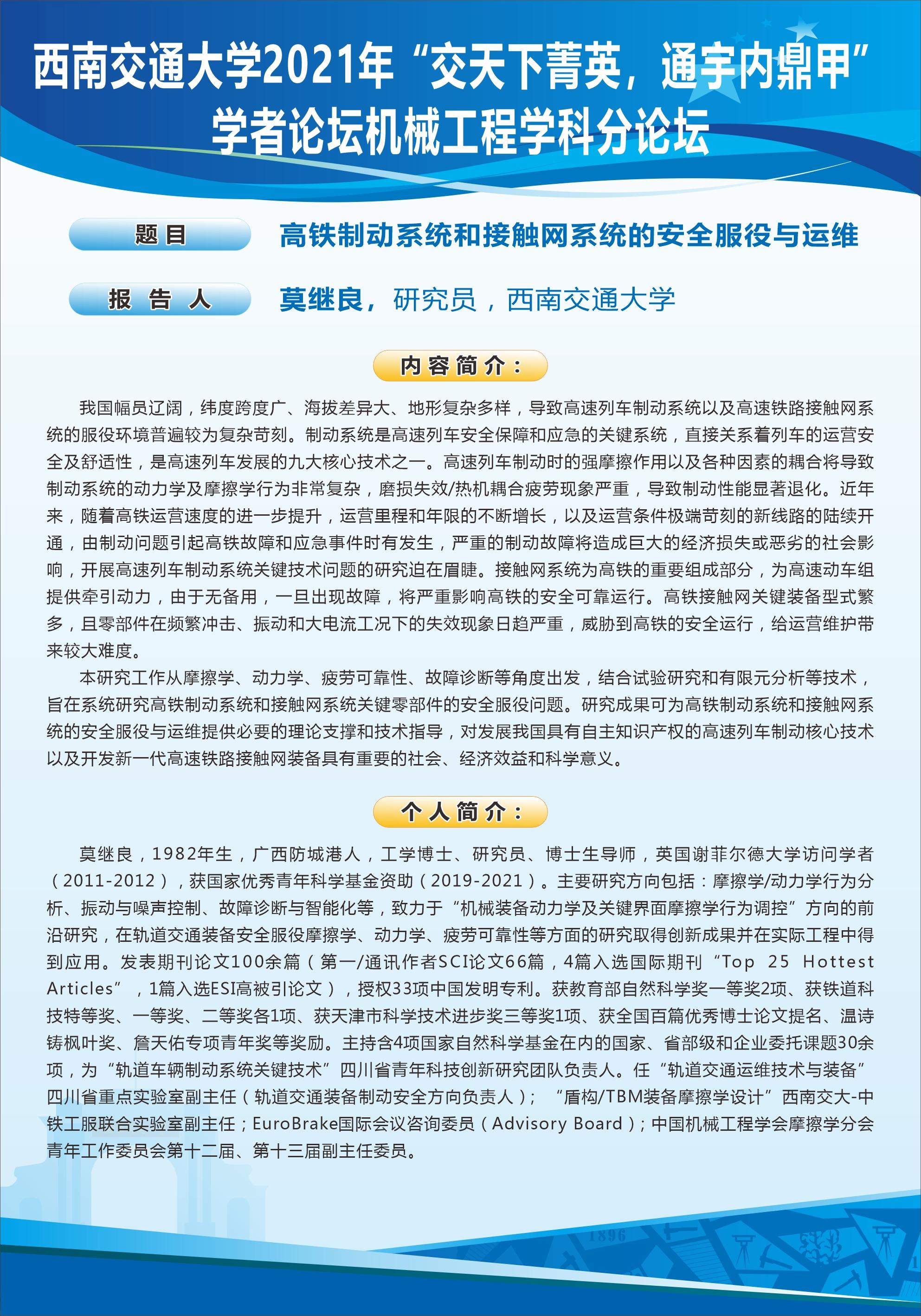 题目:高铁制动系统和接触网系统的安全服役与运维 报告人:莫继良,研究员,金年金字招牌诚信至上 |